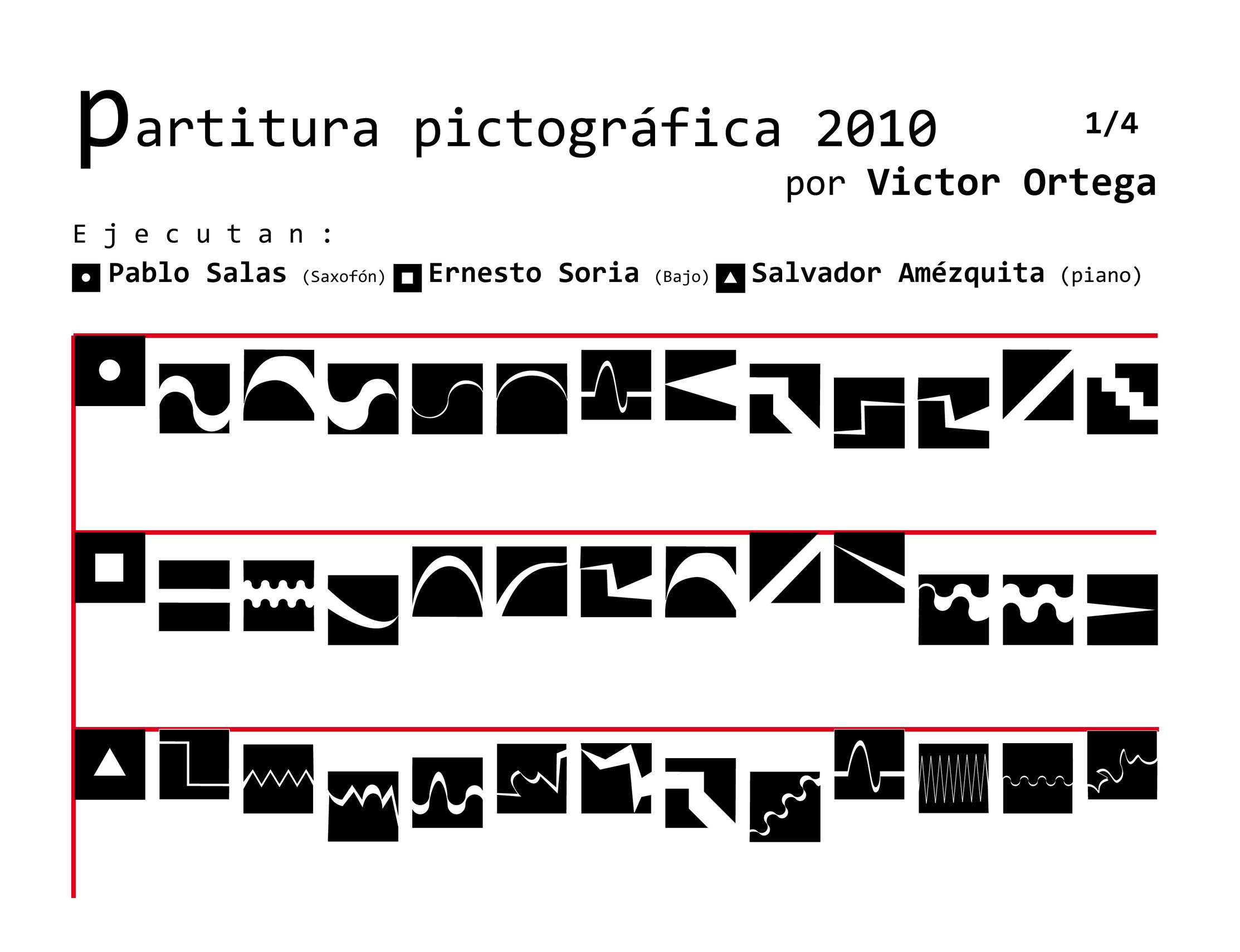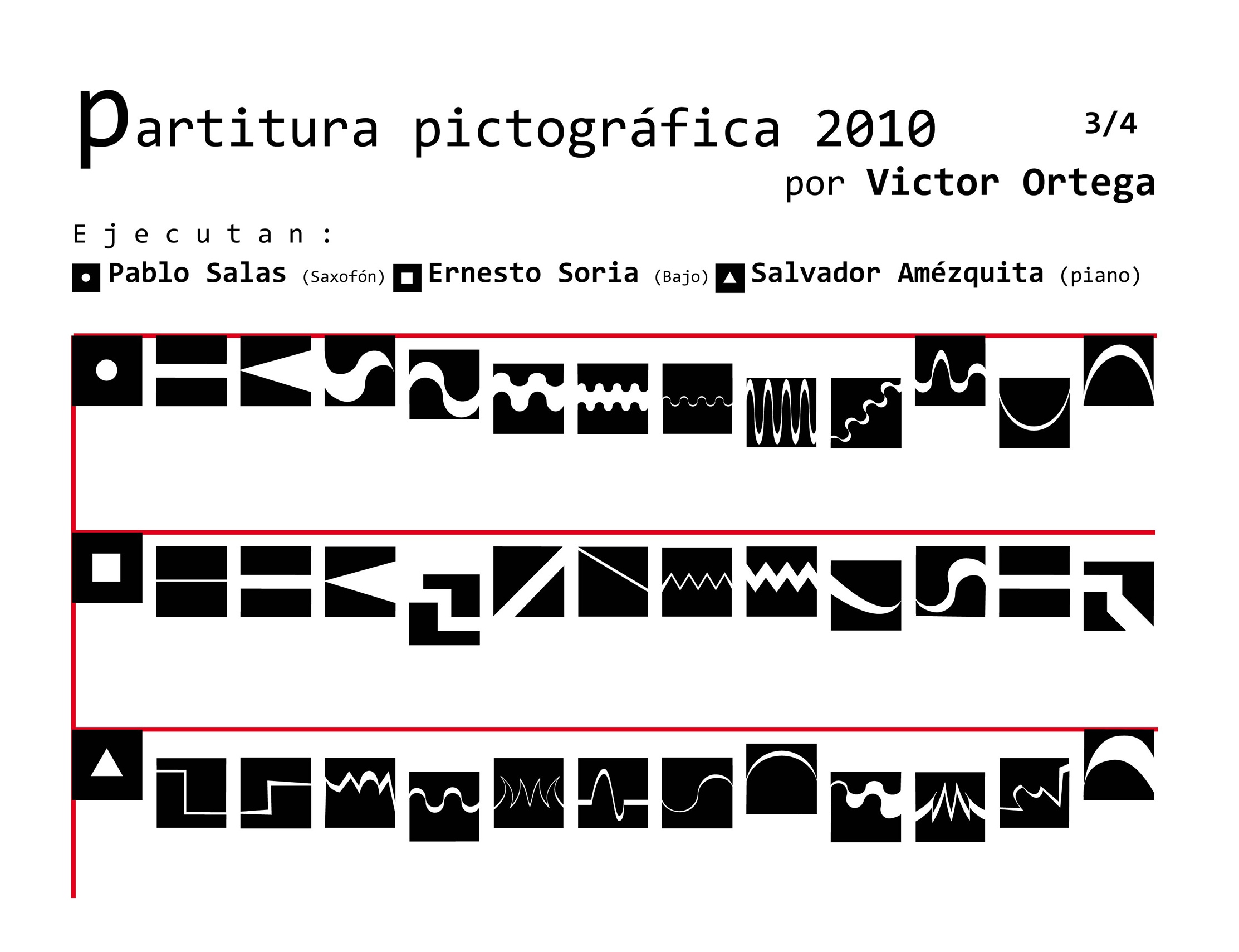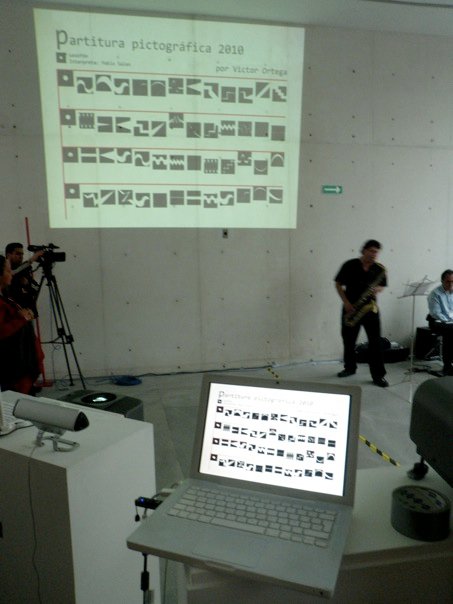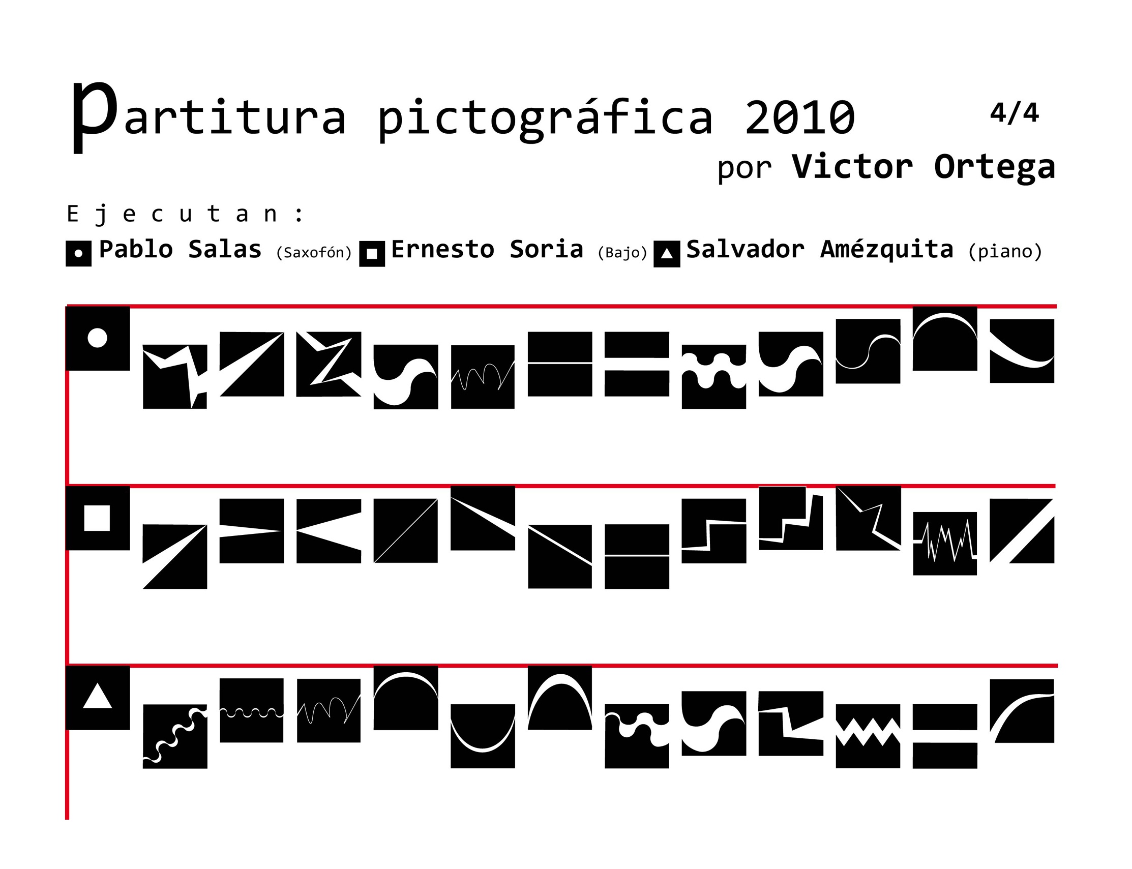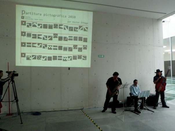 La partitura pictográfica de Victor Ortega funge como proyecto generador. Dicha partitura está realizada a partir de 52 signos gráficos; los músicos Pablo Salas, Salvador Amézquita y Ernesto Soria la ejecutarán con instrumentos musicales tradicionales: saxofón, piano y bajo. La interpretación de la pieza sonora dependerá de los procesos hermenéuticos inducidos por los signos visuales. La palabra interpretar adquiere aquí el sentido que le da Gadamer: “Lo importante es que todo interpretar no señala hacia un objetivo, sino solamente en una dirección, es decir hacia un espacio abierto que puede rellenarse de modos diversos”.*