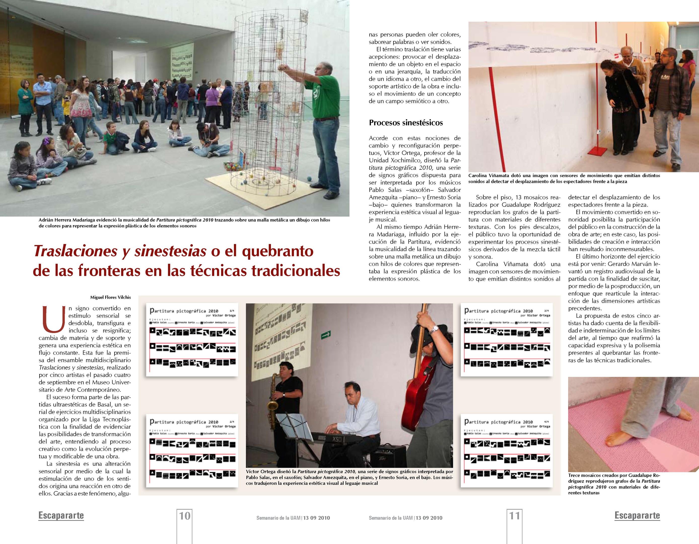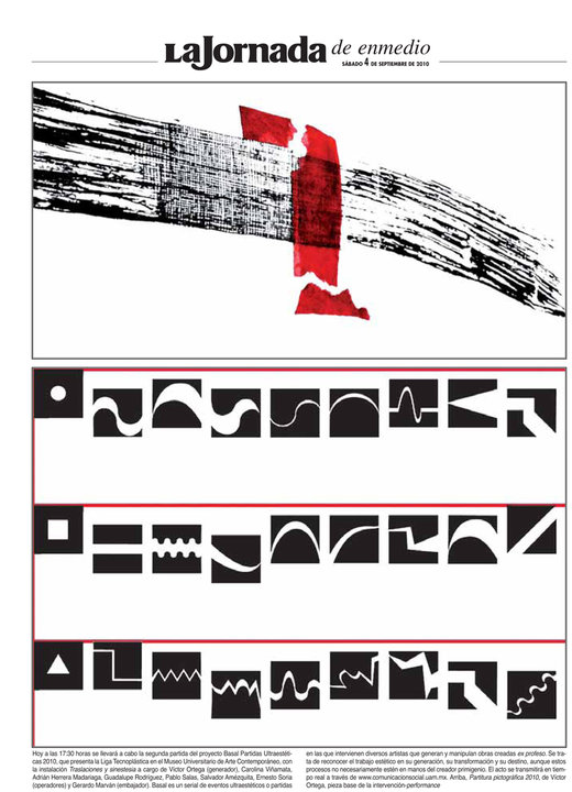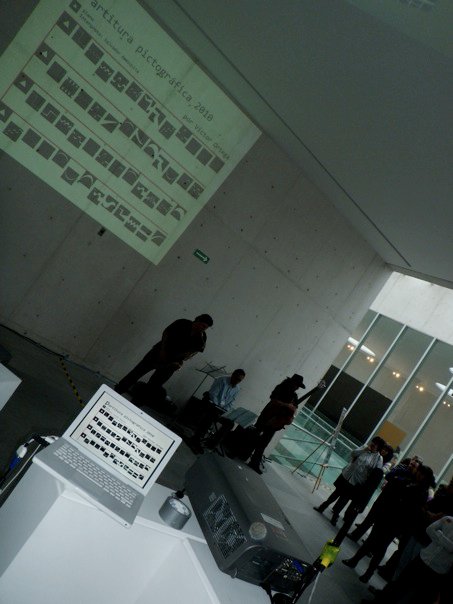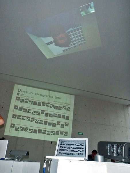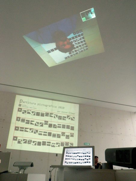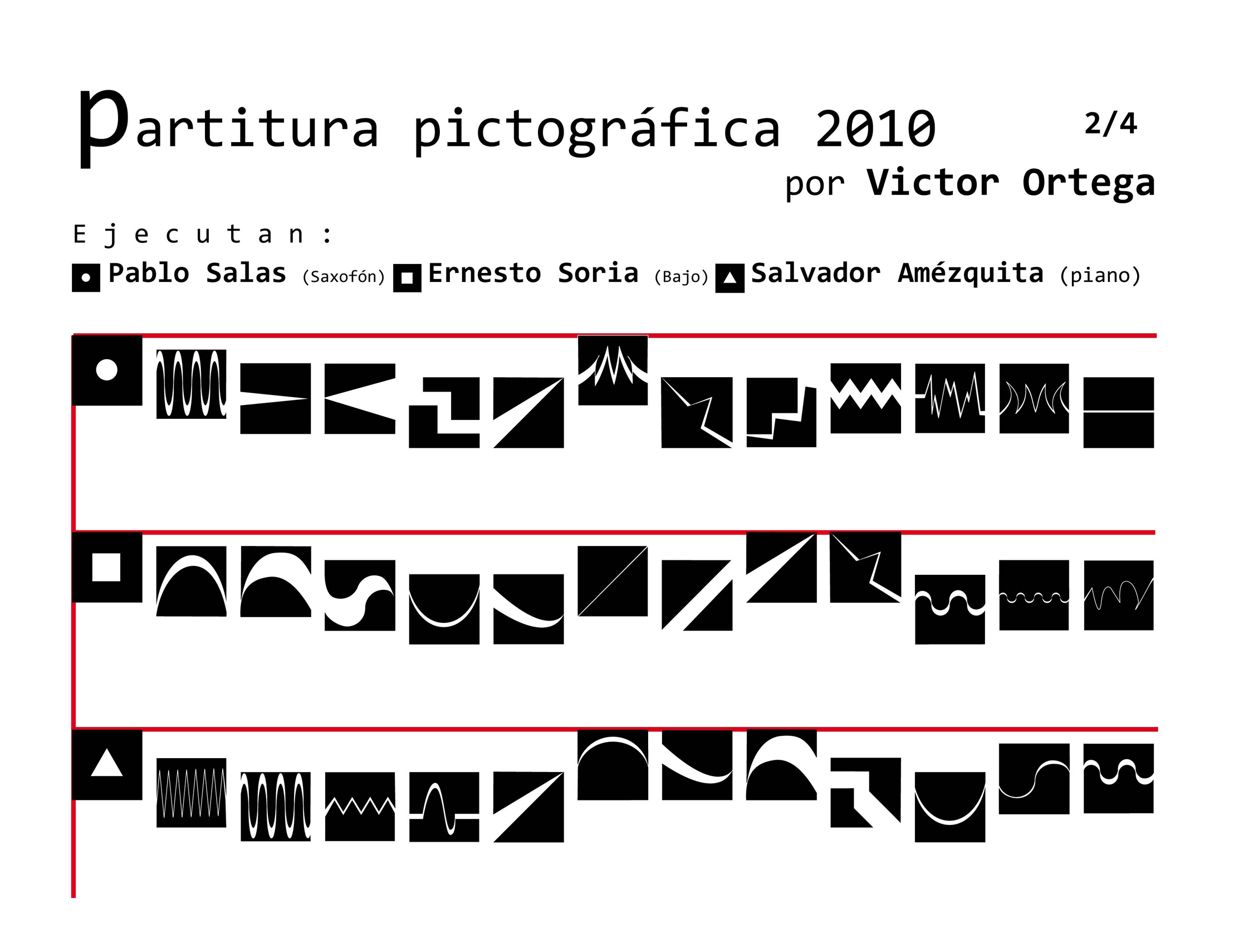 La partitura pictográfica de Victor Ortega funge como proyecto generador. Dicha partitura está realizada a partir de 52 signos gráficos; los músicos Pablo Salas, Salvador Amézquita y Ernesto Soria la ejecutarán con instrumentos musicales tradicionales: saxofón, piano y bajo. La interpretación de la pieza sonora dependerá de los procesos hermenéuticos inducidos por los signos visuales. La palabra interpretar adquiere aquí el sentido que le da Gadamer: “Lo importante es que todo interpretar no señala hacia un objetivo, sino solamente en una dirección, es decir hacia un espacio abierto que puede rellenarse de modos diversos”.*